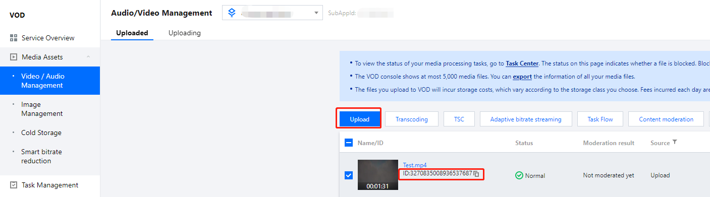 参考 快速入门 - 步骤2 上传一个测试视频。单击 此处 查看本 Demo 使用的测试视频,对应的 FileId 是 3270835008936537687,如下图所示: