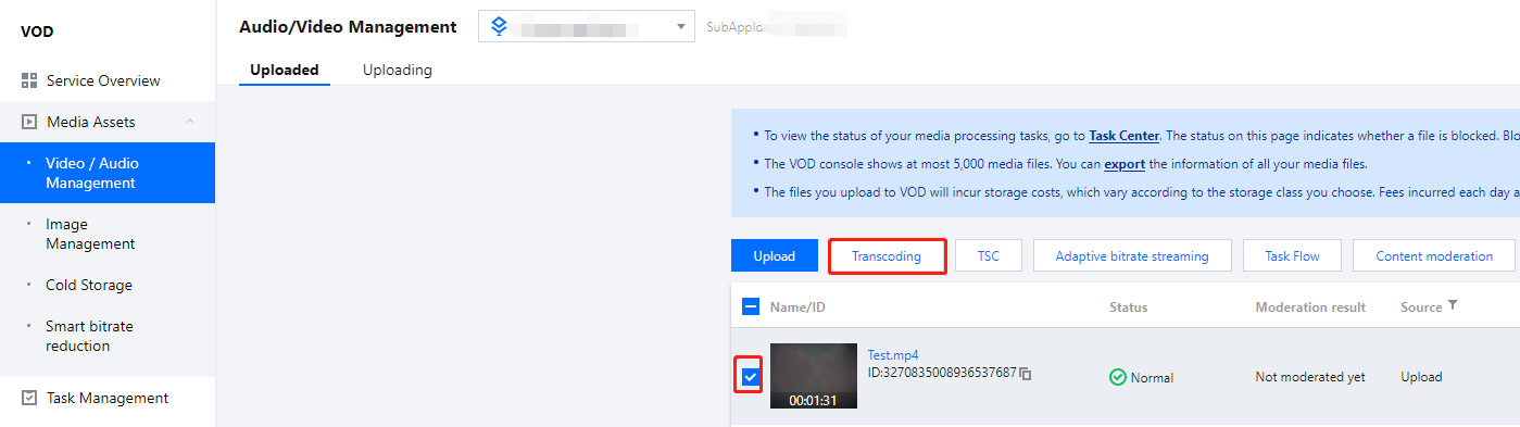 1. 在控制台 音视频管理 页面勾选新上传的测试视频,然后单击转码