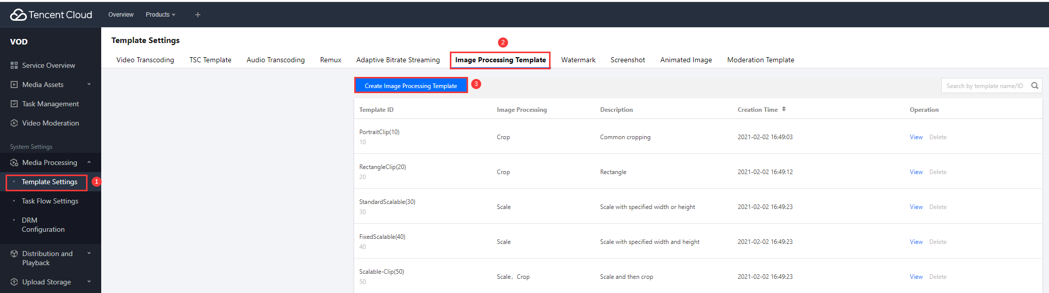 2. 页面展示了可用的模板列表,包括云点播系统预设的一些常用模板,我们也可以创建模板,例如创建240 x 240缩略图模板,按照下图示指引创建模板: