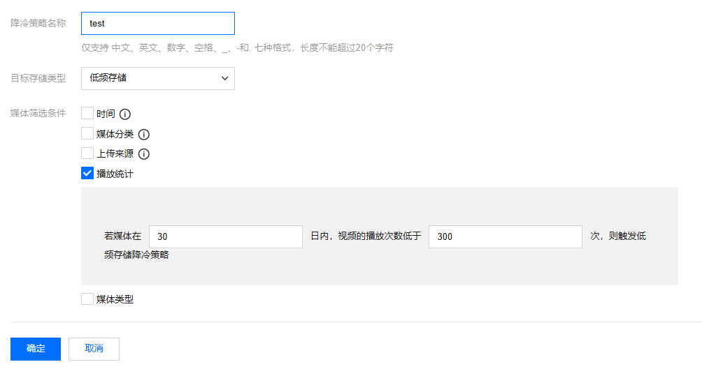 示例:如图所示则为若媒体在30日内,视频播放次数低于300次,则触发低频降冷策略;云点播会选取满足所有规则的媒体进行降冷。