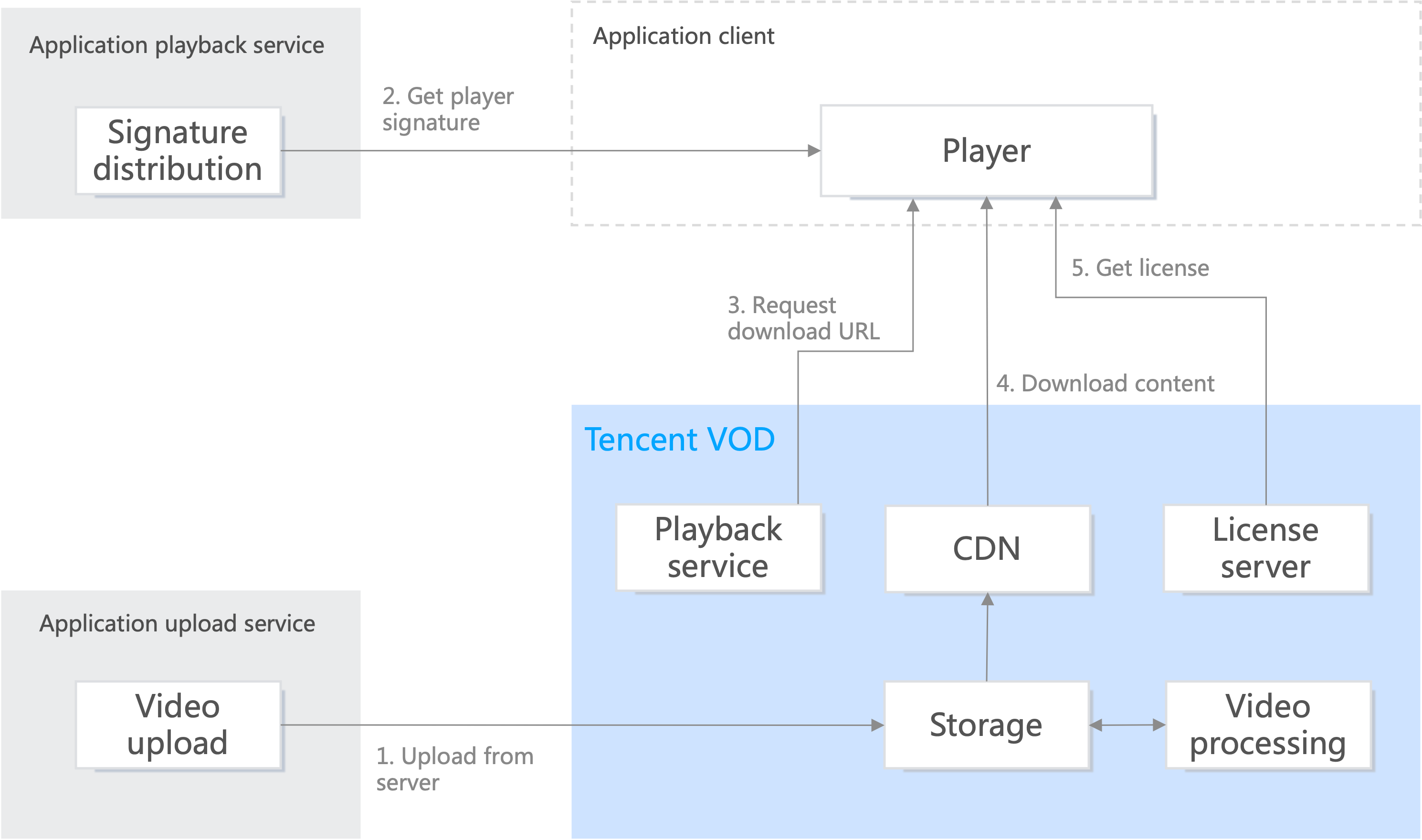 云点播 DRM 集成成案:由腾讯云点播提供 DRM 许可证服务;