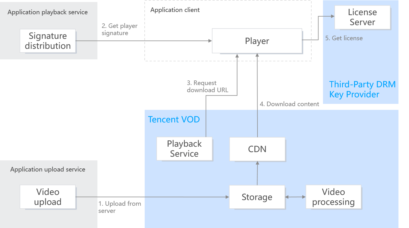 在此方案中,云点播提供转码、加密、存储、CDN 等功能,第三方 DRM 提供商(华曦达 SDMC)提供证书管理、License 派发等功能。