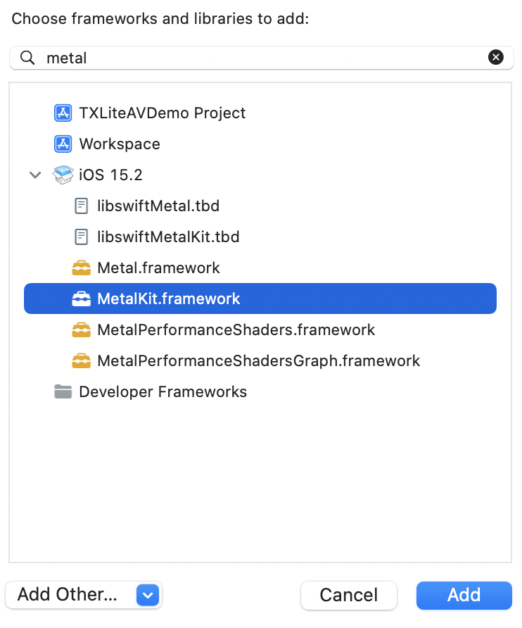 MetalKit.framework:打开 Xcode,切换到“project setting - Build Phases - Link Binary With Libraries”,选择左下角的“+”号,并输入“MetalKit”,并加入项目工程中,如下图所示: