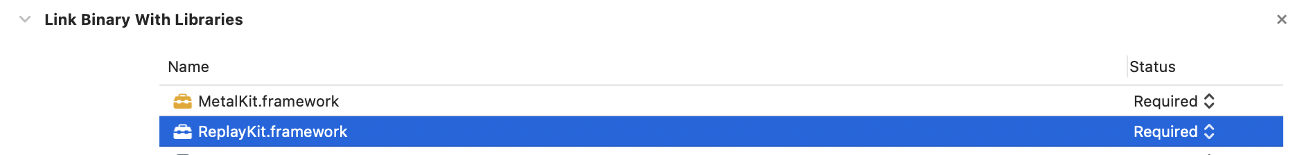 ReplayKit.framework:打开 Xcode,切换到“project setting - Build Phases - Link Binary With Libraries”,选择左下角的“+”号,并输入“ReplayKit”,并加入项目工程中,如下图所示: