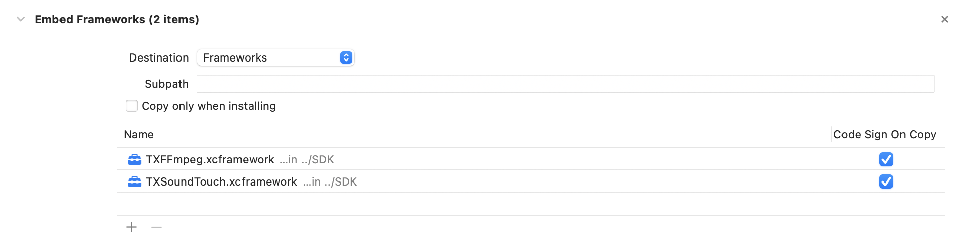 TXSoundTouch.xcframework:将.xcframework 文件添加到项目工程中,并在“General - Frameworks, Libraries, and Embedded Content”中将其设置为“Embed&Sign”,并在“Project Setting - Build Phases - Embed Frameworks”中进行检查,设置“Code Sign On Copy”选项为勾选状态,如下图所示: