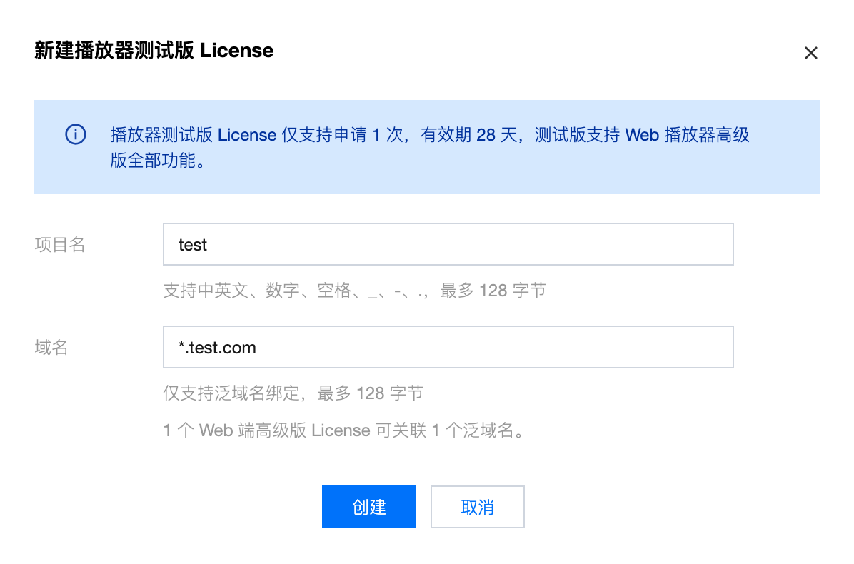 播放器 SDK 提供测试版 License,包含播放器移动端测试 License 和播放器 Web 端测试 License,您可参照本文档指引,按需免费申请使用。