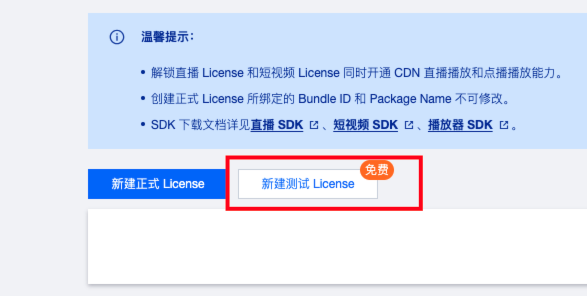 1. 登录 云点播控制台 或 云直播控制台 > License 管理 > 移动端 License,单击新建测试 License。 2. 根据实际需求填写 App Name、Package Name 和 Bundle ID,选择播放器高级版,单击确定。