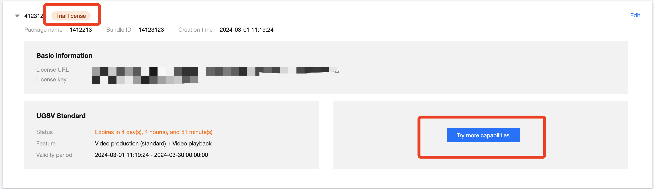 测试版 License 有效期内可单击右侧的编辑,进入修改 Bundle ID 和 Package Name 信息,单击确定即可保存。
