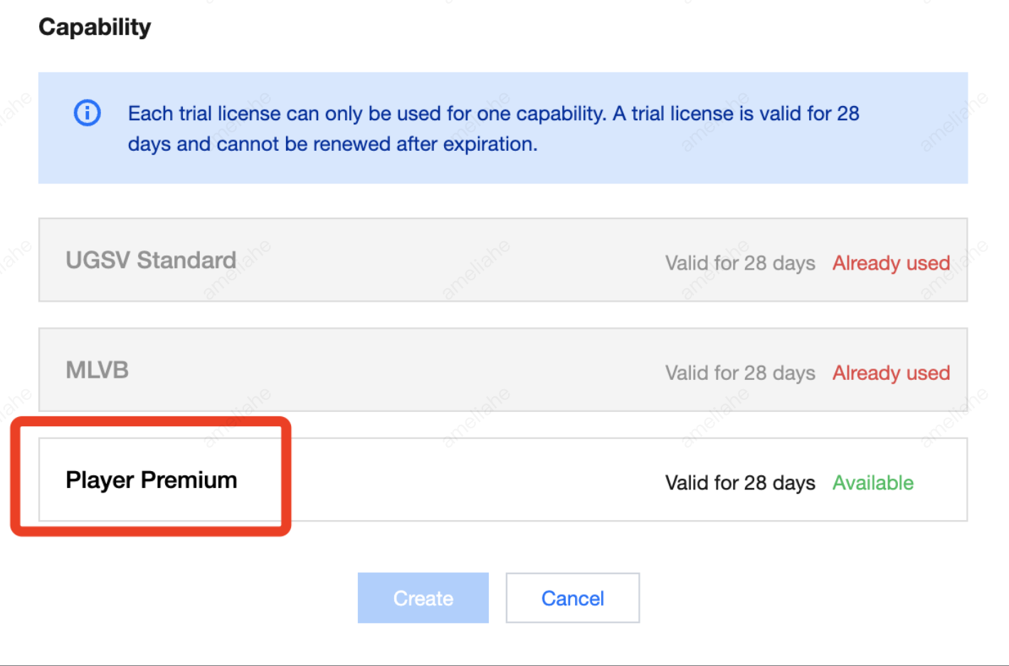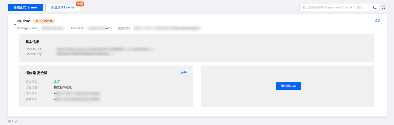 您可以免费申请播放器移动端测试 License (有效期共28天)体验测试。申请测试模块时,您可以选择新建测试 License 并选择播放器测试 License 或在已创建的测试应用中申请测试新 License 两种方式创建测试 License。