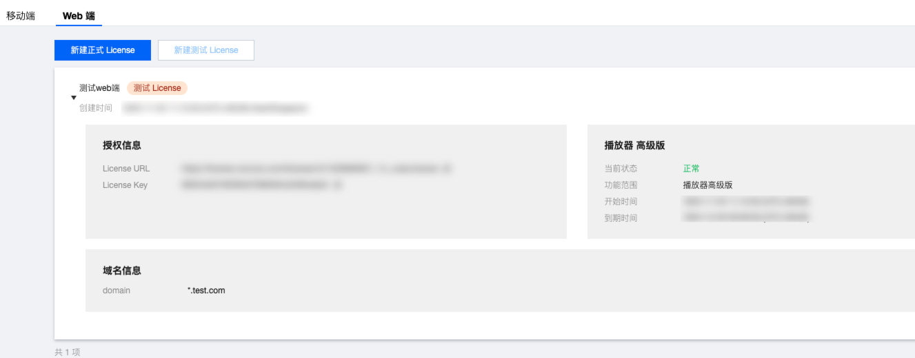 方式一:新建测试 License 并选择播放器测试 License