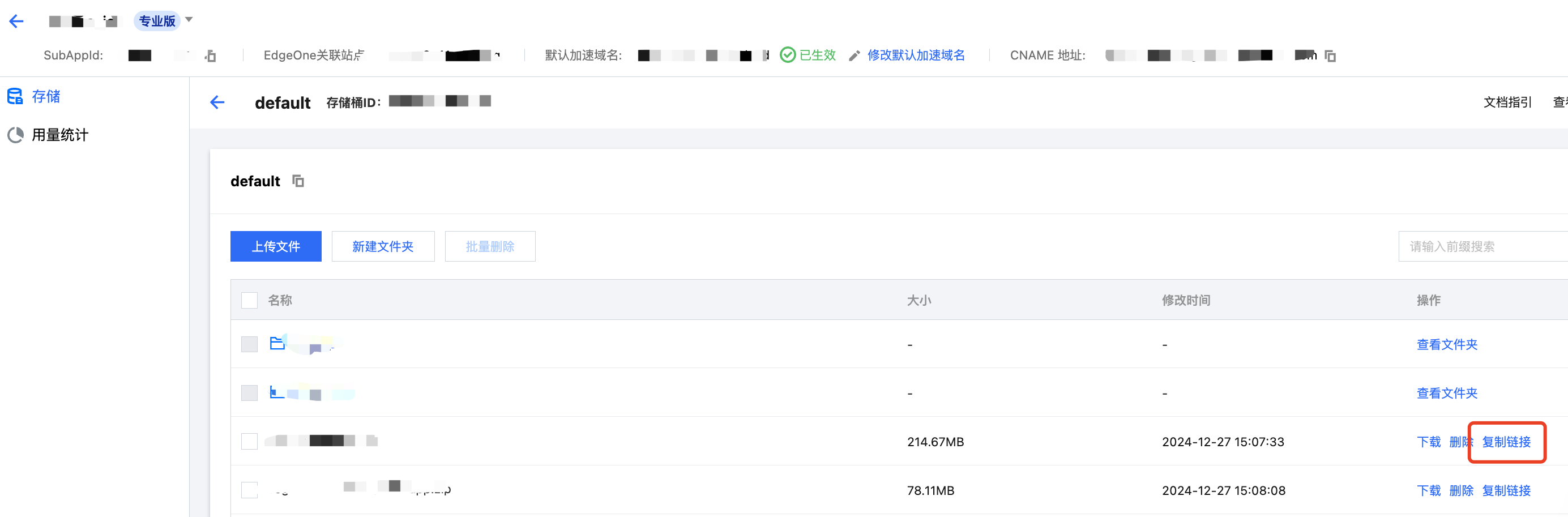 4. 在存储桶的文件列表页面,找到需要分享的文件,单击操作中的复制链接既可将文件复制后分享给其他用户。
