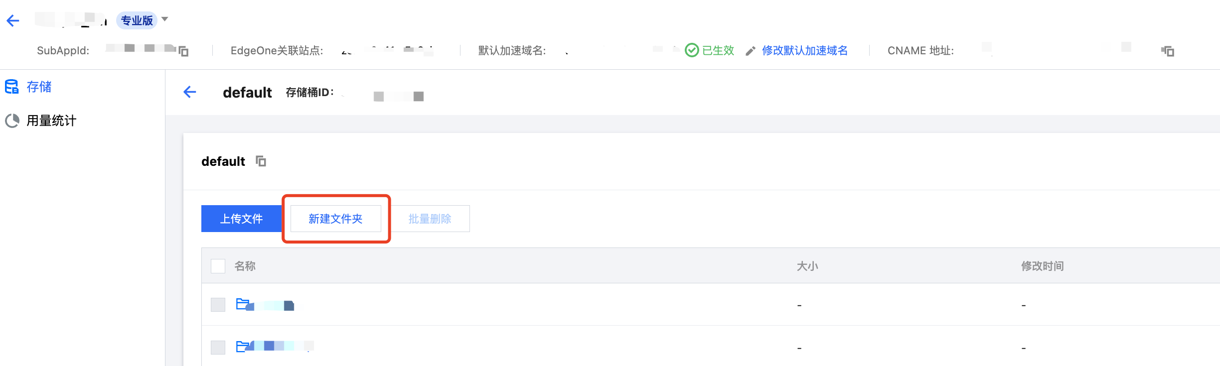 3. 在应用存储页面,选择需要创建文件夹的存储桶,单击存储桶名称进入存储桶的文件列表页面。