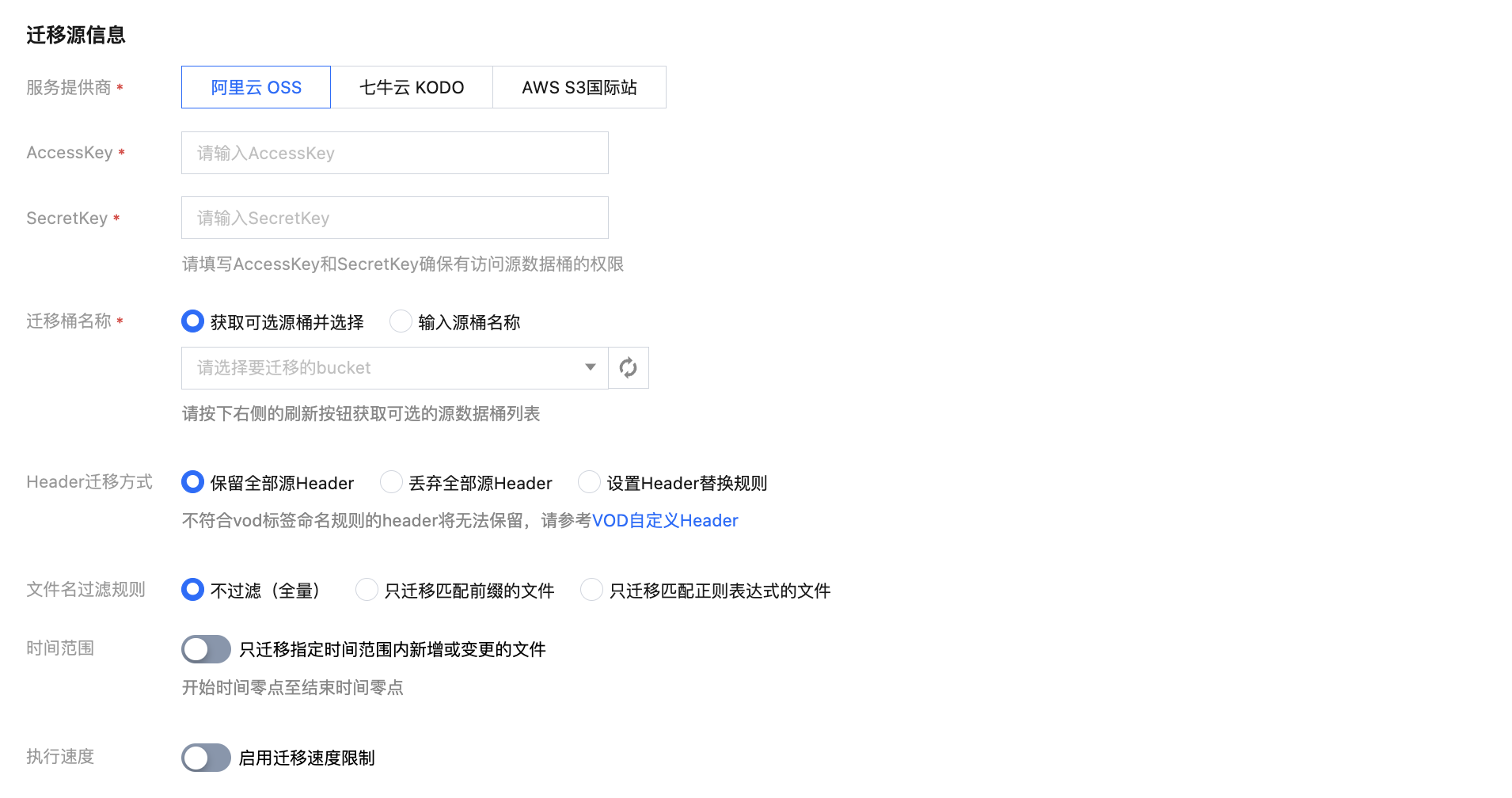 服务提供商:此处迁移源服务提供商应选择阿里云 OSS。