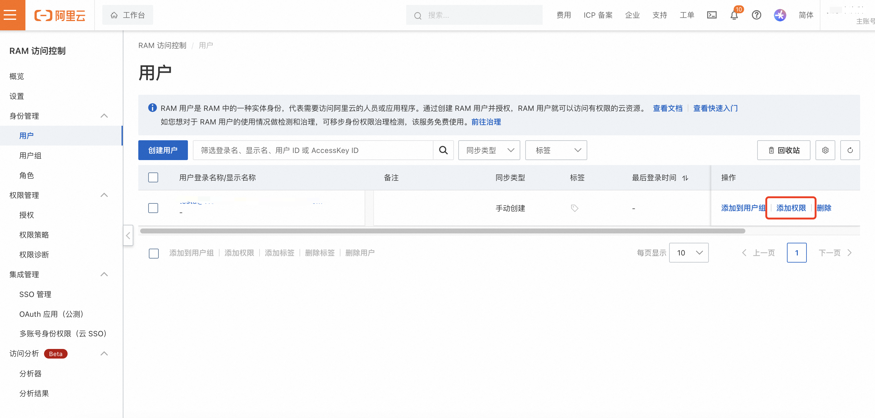 4. 用户创建完成后,回到用户列表页面,单击添加权限。