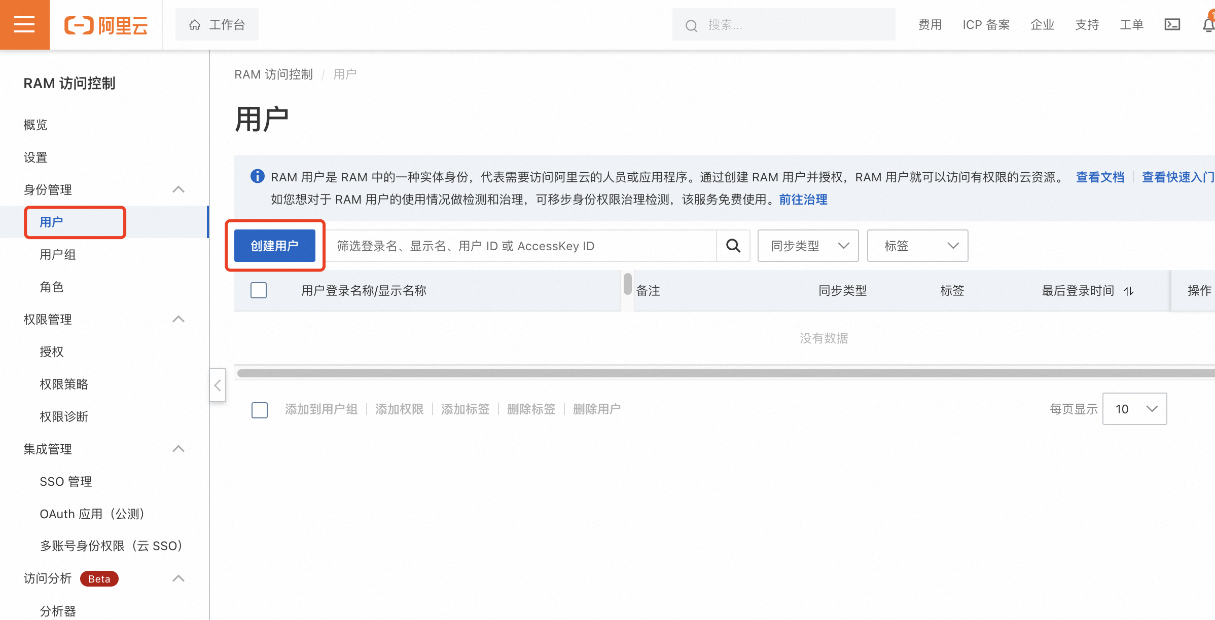1. 登录阿里云控制台,进入 RAM 访问控制页面,进入身份管理 > 用户页面,并单击创建用户。