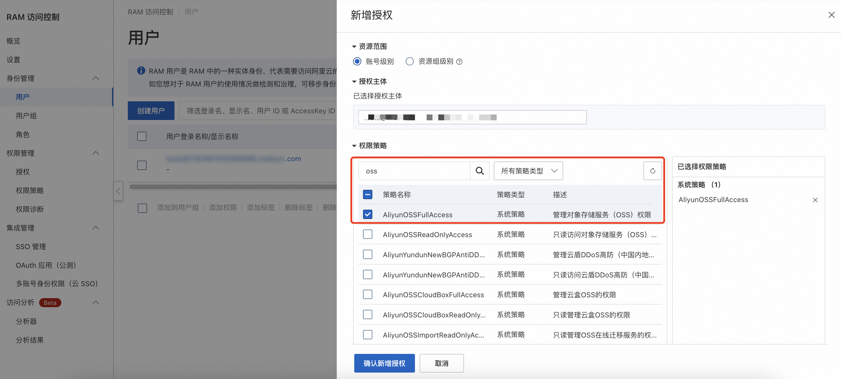 5. 在新增授权页面的权限策略中,输入"OSS"检索策略,并勾选 AliyunOSSFullAccess,单击确认新增授权。