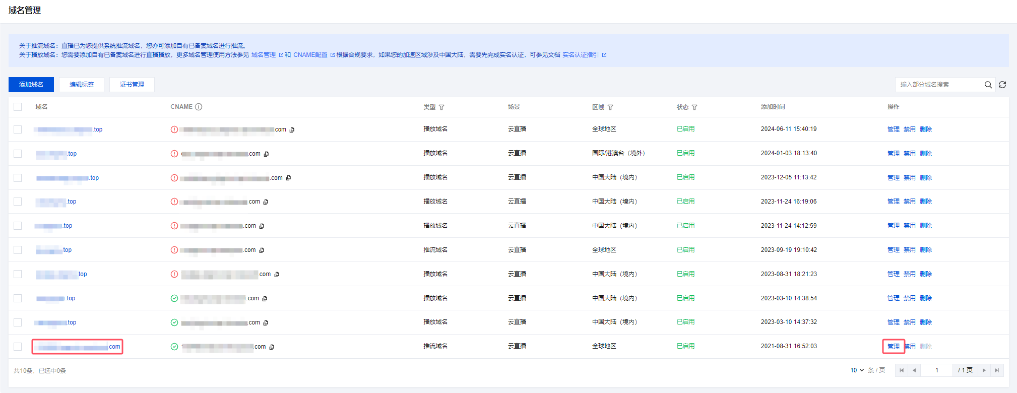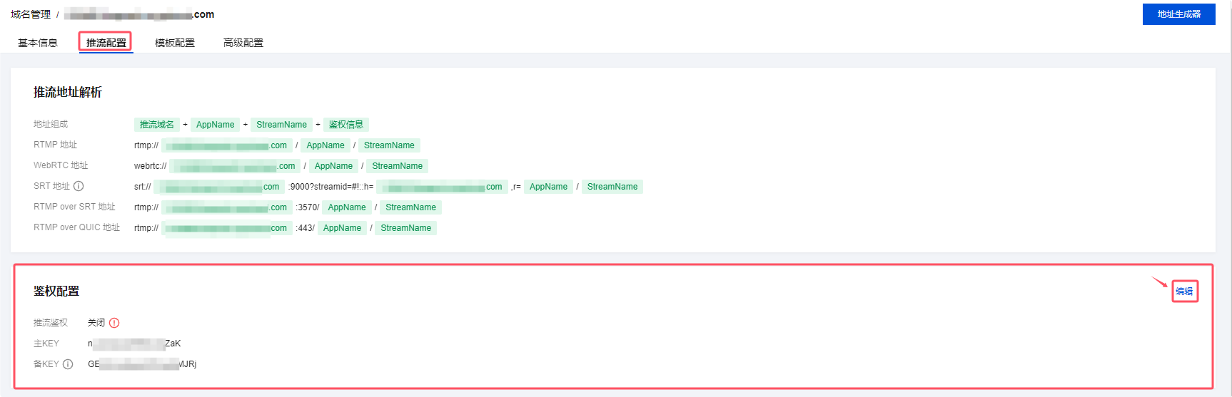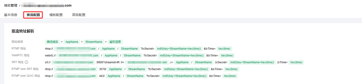 xxxx.tlivepush.com,您可通过该域名进行推流测试,但不建议您在正式业务中使用这个域名作为推流域名。
