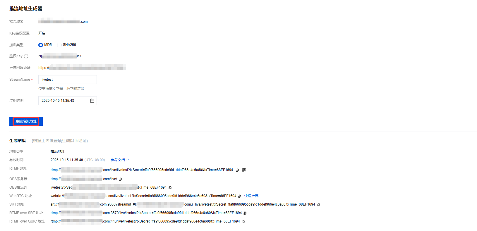rtmp://domain/AppName/StreamName?txSecret=Md5(key+StreamName+hex(time))&txTime=hex(time)