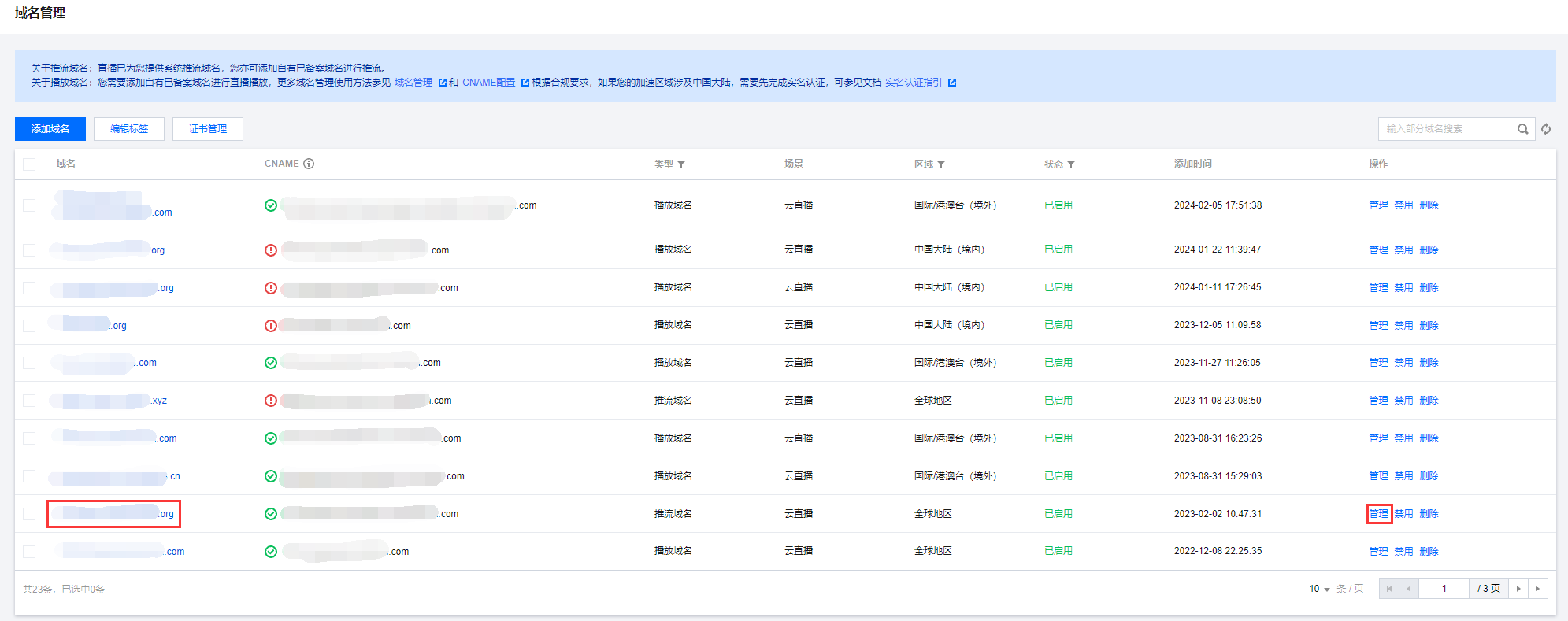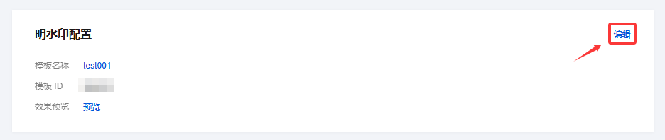 1. 进入域名管理,单击需配置的推流域名或管理进入域名详情页。 2. 选择模板配置页签,单击明水印配置标签右上角的编辑。