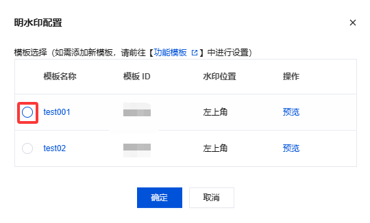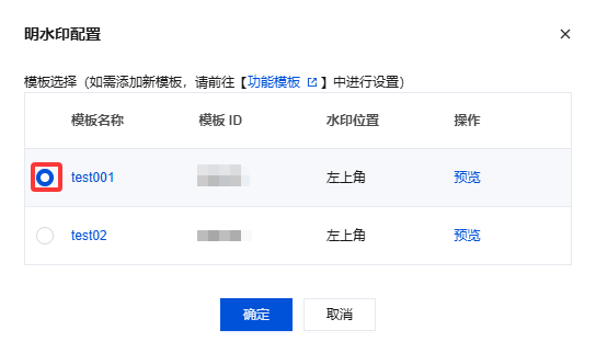 模板关联成功后,指定推流域名下的推流地址开启明水印功能。
