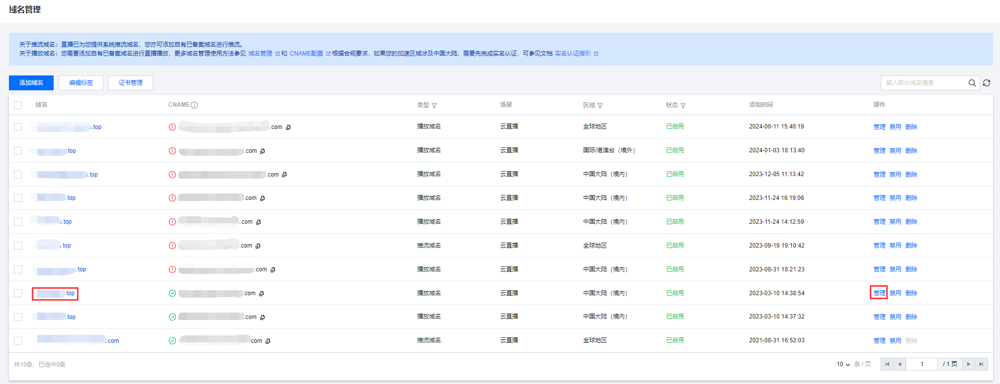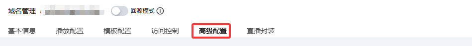 1. 进入 域名管理,单击需配置的播放域名或右侧的管理进入域名详情页。 2. 在高级配置中,查看区域配置标签。