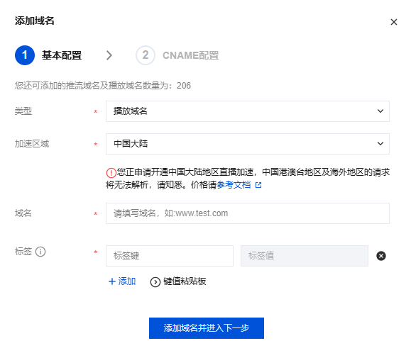 添加新域名、选择播放域名的过程中,请选择直播播放分发所需的加速区域,例如“中国大陆”。接下来,填写域名信息,并可选择性地填写标签。 单击添加域名并进入下一步。