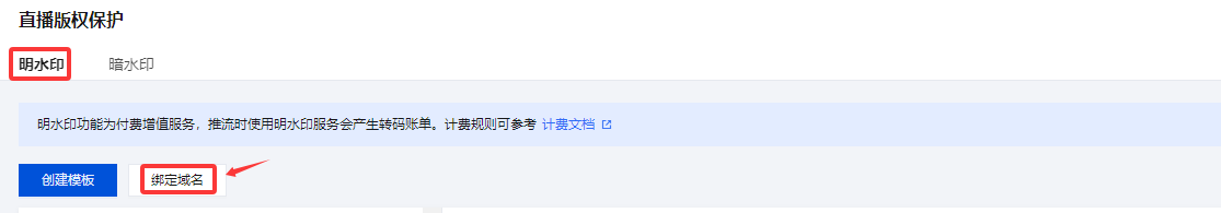 新明水印模板创建成功后关联域名:明水印模板创建 成功后,单击提醒框中的去绑定域名。 3. 在绑定域名窗口中,选择您需绑定的明水印模板和推流域名(可同时绑定多个推流域名),单击确定即可绑定成功。