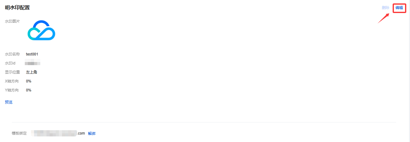 1. 登录云直播控制台,进入功能配置 > 直播水印> 明水印。 2. 选择您已创建成功的明水印模板,并单击右侧的编辑,即可进入修改模板信息。