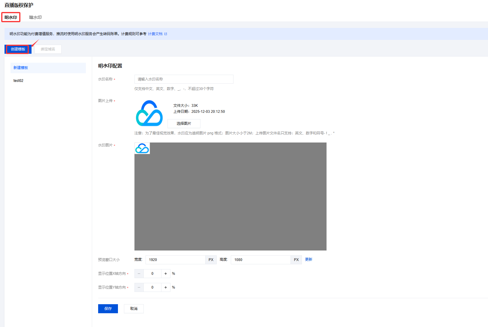 2. 选择明水印,单击创建模板,进入明水印模板创建页面,进行如下配置: