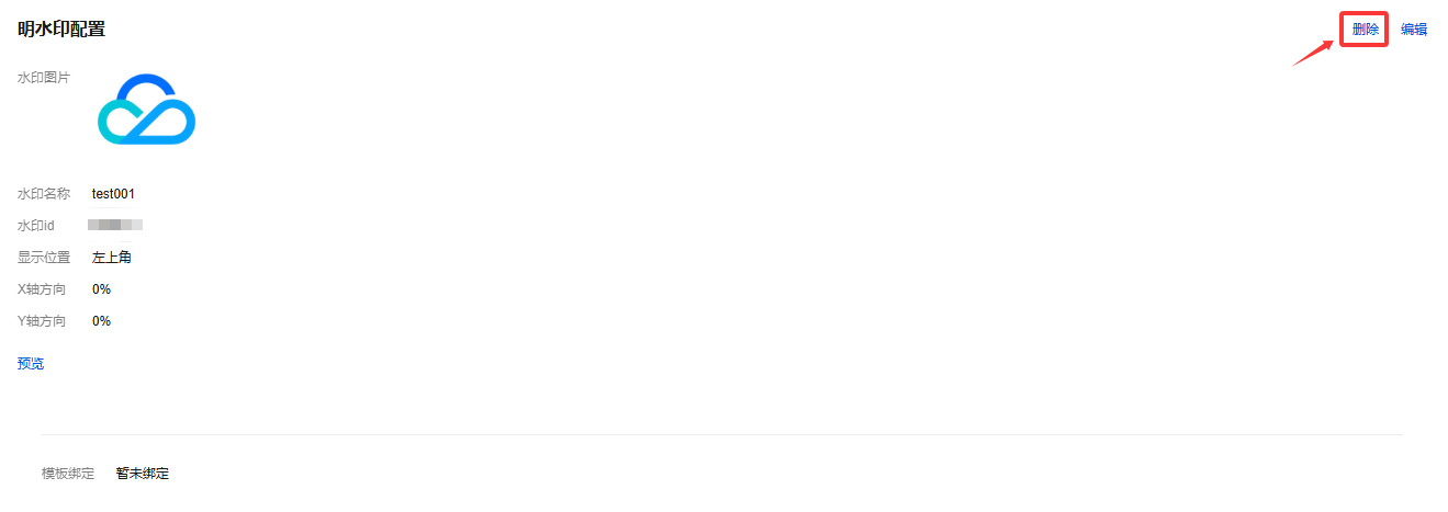 2. 选择您已创建成功的明水印模板,单击右上方的删除。