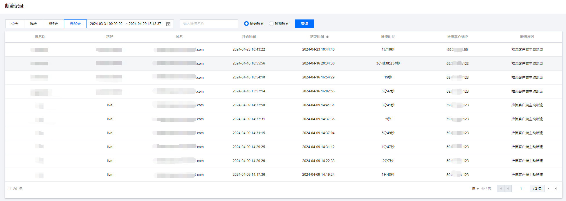 20 | 0 | 系统主动断开长时间无数据的推流 |