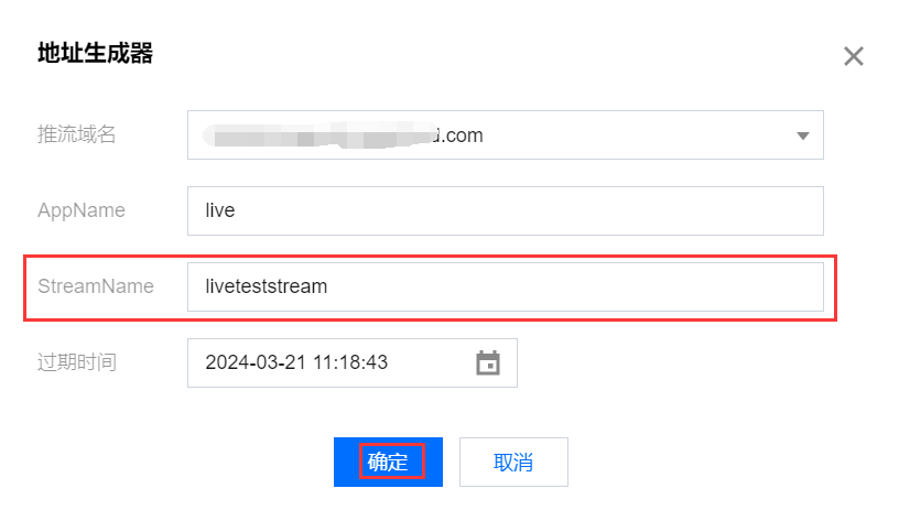 1. 进入云直播控制台的常用工具 >地址生成器 生成推流地址,在该页面进行如下配置: 选择地址类型:推流地址。