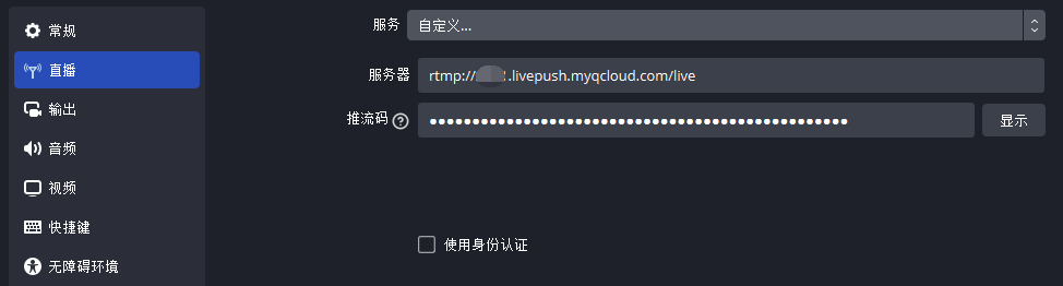 本文档以安装 OBS 推流为例,操作步骤如下说明。假设准备好的推流地址为: rtmp://3891.livepush.myqcloud.com/live/3891_test?bizid=3891&txSecret=xxx&txTime=58540F7F