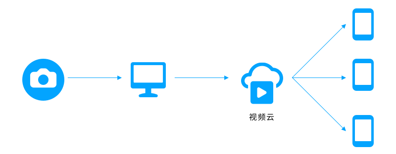 云直播的服务本质是一个广播的过程,类似于电视台的直播节目通过有线电视网发送给千家万户。为了完成这个过程,云直播需要有采集和推流设备(类似摄像头)、云直播服务(类似电视台的有线电视网)和播放设备(类似电视)。而采集和推流设备以及播放设备可以是手机、PC、Pad 等智能终端以及 Web 浏览器,相应设备上的推流软件我们也已经为您提供了完整的 Demo。