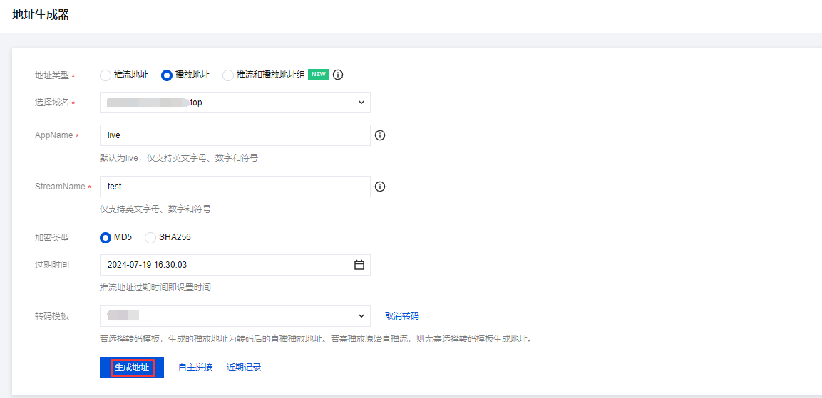 进入云直播控制台 > 常用工具 > 地址生成器 ,进入地址生成器页面,获取播放地址,在该页面进行如下配置: 选择生成类型为:播放域名。