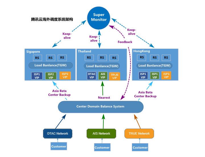 下面以泰国为例说明,针对三个不同(DTAC,AIS,TRUE)的用户,中心调度系统收录海量的国外 IP 以及运营商,并根据用户的 IP 自动调度就近 CDN 节点,识别的精度可以达到99.5%以上。同时支持机房异常切换,当监控探测节点发现某个区域异常,系统自动选择最优的机房进行切换。