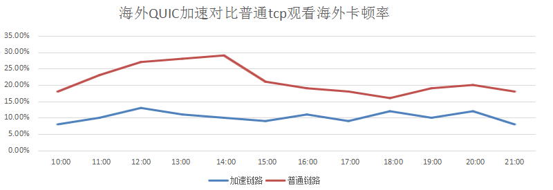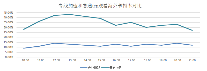 为直观展现海外中心节点的加速效果,对中国大陆用户观看美国的主播视频进行统计对比,效果如下图所示, 明显可以看出专线加速卡顿率低,且网络稳定。