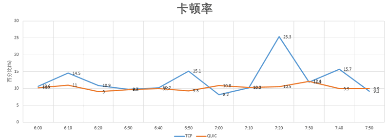 下图为阿联酋主播推流到阿联酋加速点,拨测全球用户观看该主播卡顿率对比,从对比数据看,走 QUIC 加速流卡顿率非常稳定。