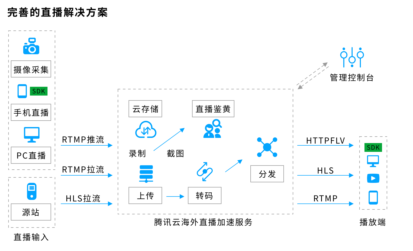 完整的直播服务除了推流与观看之外,还应包括鉴权,转码,截图,录制,回调、鉴黄、DRM 等功能,下图是腾讯云海外直播解决方案的基础功能模块。