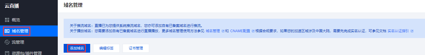 进入云直播控制台,在左侧导航栏中选择 域名管理,然后单击添加域名。 在弹出的添加域名框里选择类型播放域名,再选择对应的加速区域,最后填上需要加速的域名即可。