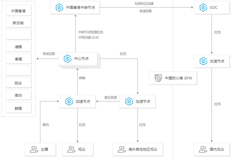 腾讯云在中国香港,泰国,新加坡,德国,硅谷,南非,韩国等地都已完成多个中心机房建设,并在逐渐扩大中心机房建设覆盖国家区域。中心机房包括了海外直播需要的所有模块,同时为服务全球用户,保证任何数据中心异常都可以进行切换,要求整体架构做到去中心化。考虑到跨国网络质量和稳定对直播时延和卡顿的影响,海外建设的中心节点都通过专线互联,中国大陆和海外通过中国香港中心中转节点专线互联,整体的缩略架构如下所示。