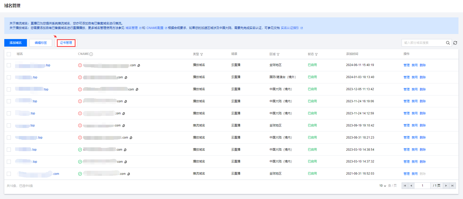 1. 进入云直播控制台的 域名管理,单击证书管理进入证书管理配置页。 2. 单击配置证书,创建新的证书配置。