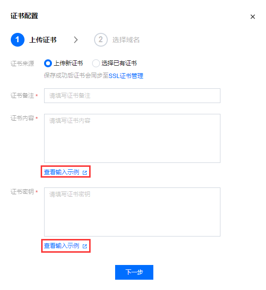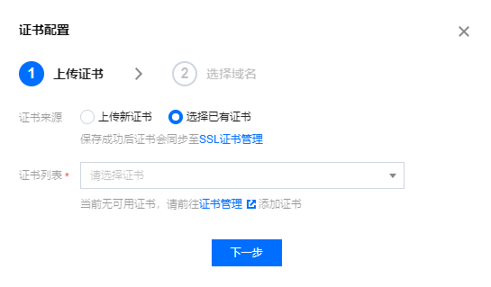3. 在证书配置弹窗中选择证书上传方式,其中腾讯云支持两种证书来源: