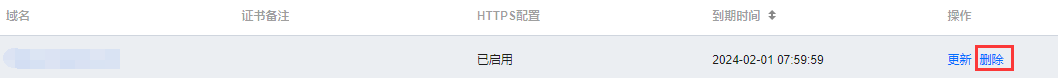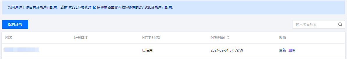 配置证书 完成后,您可在证书管理的配置列表中查看您已创建成功的配置信息。展示数据包括您已配置证书的域名、证书备注、证书来源、HTTPS 配置以及到期时间。 更新证书配置
