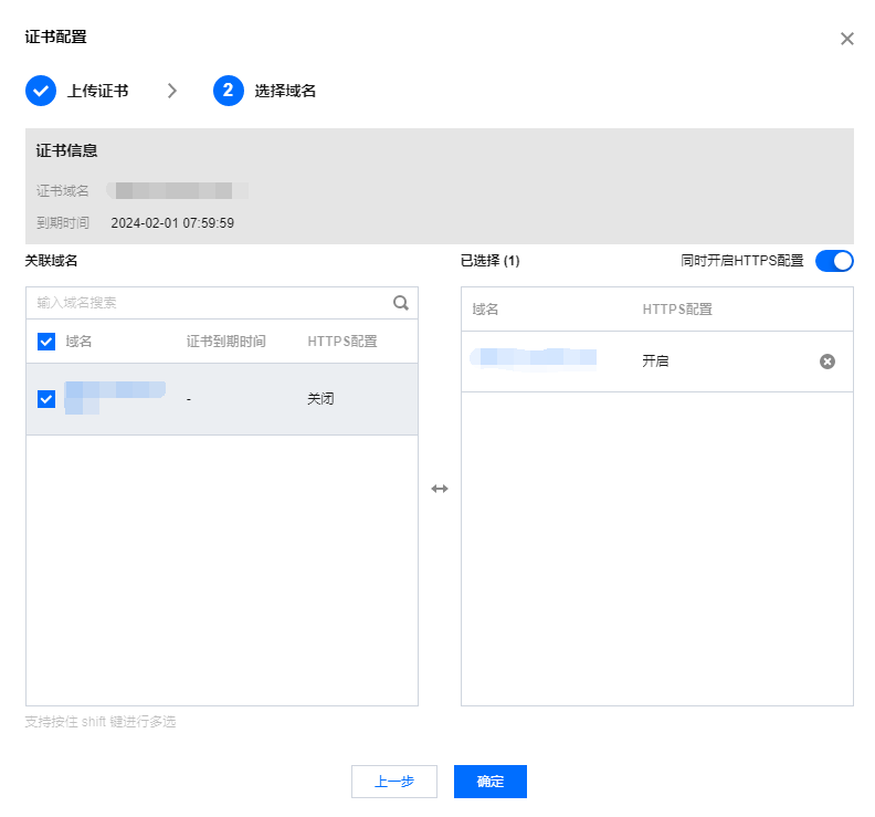 4. 证书校验正确后,单击下一步,进入选择域名配置页。