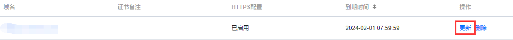 1. 在证书管理的配置列表中,单击需要更新的配置列右侧的更新。