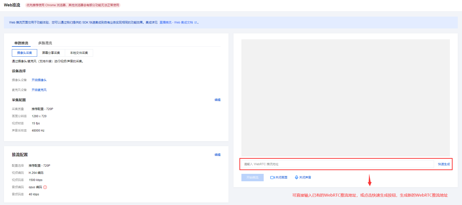 Web 端直播推流:基于浏览器通用的 WebRTC 标准进行设计和封装,通过引入代码片段就能实现在浏览器中进行直播推流,详情请参见 Web 推流。 注意: