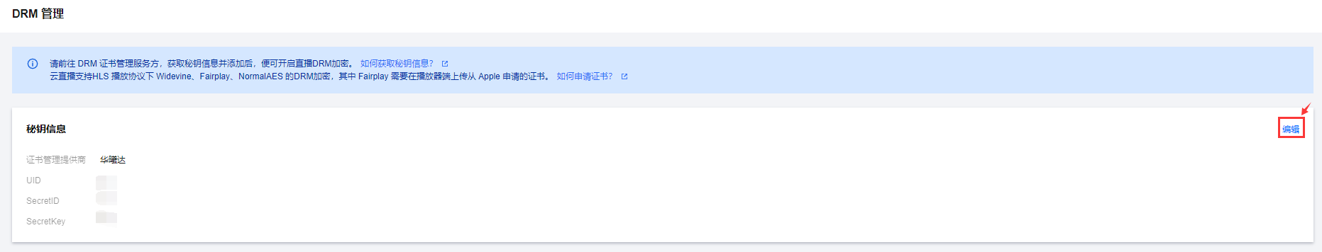 设置用户访问华曦达(SDMC)DRM 密钥信息,需要设置 UID、SecretID、SecretKey,这些密钥信息需要从证书的第三方服务商处获取。