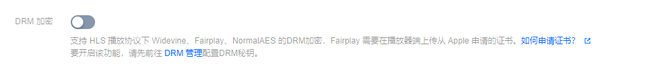 DRM 加密 | 否 | DRM 加密开关,默认关闭。开启该功能前要求在 DRM 管理中配置 DRM 密钥。 |