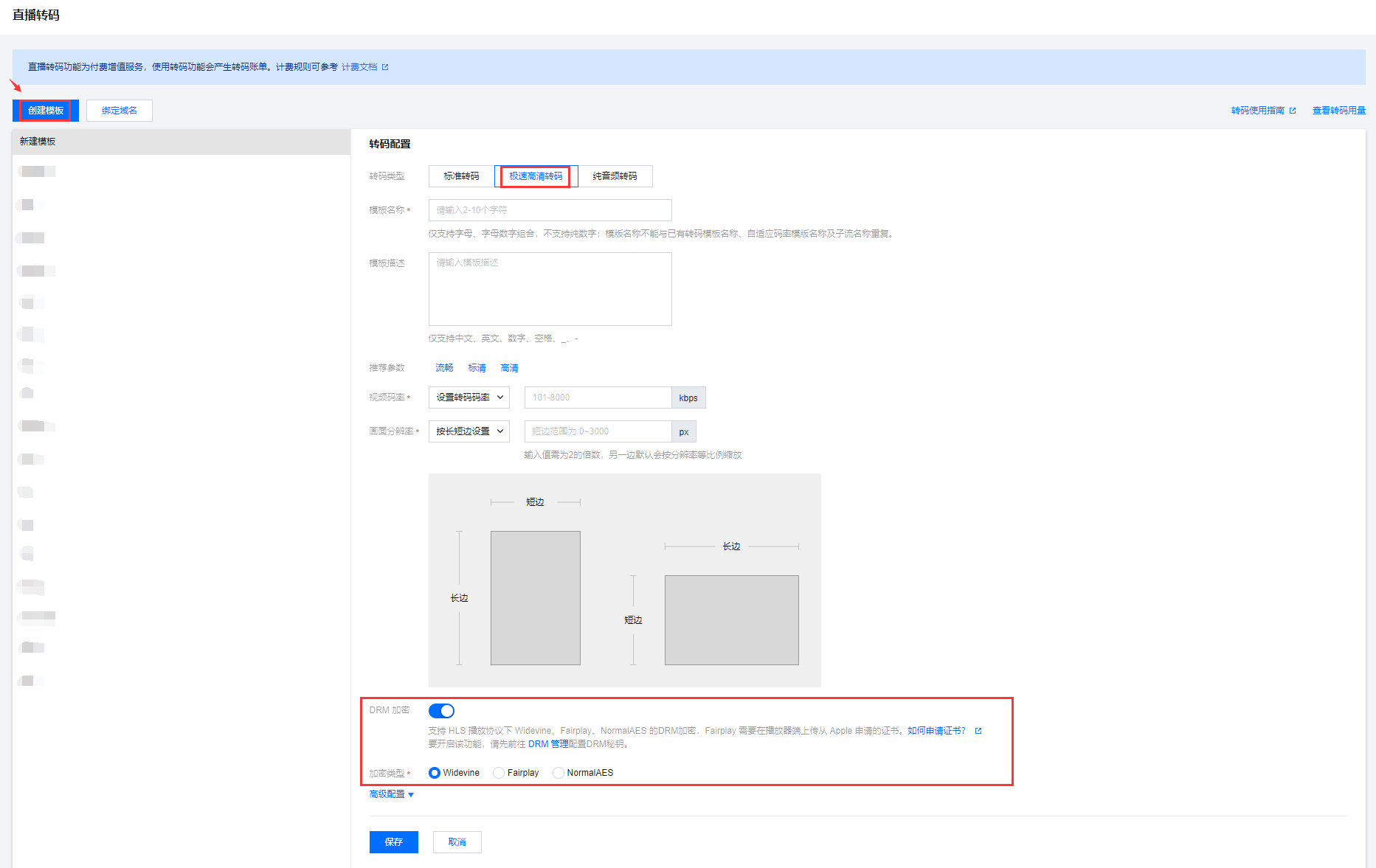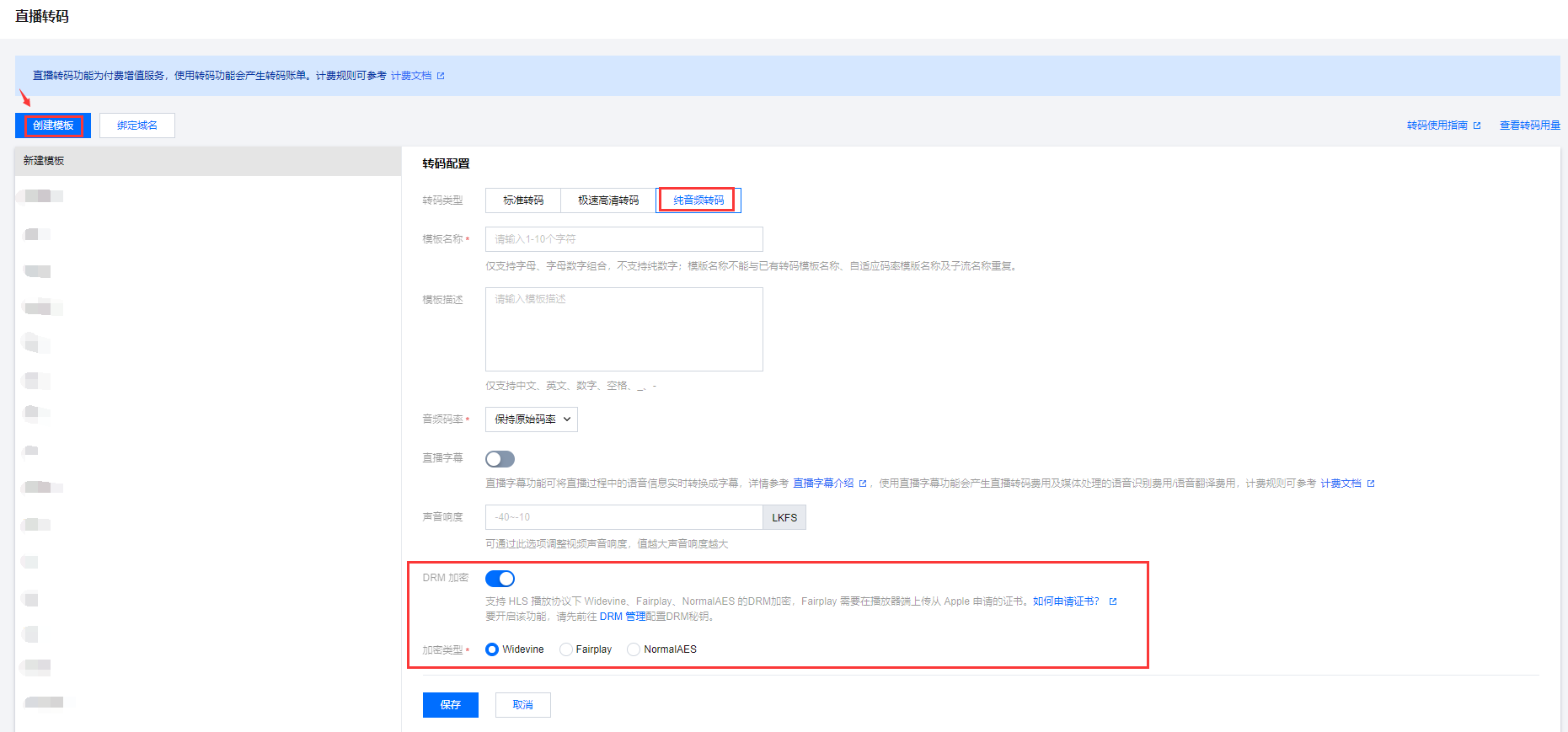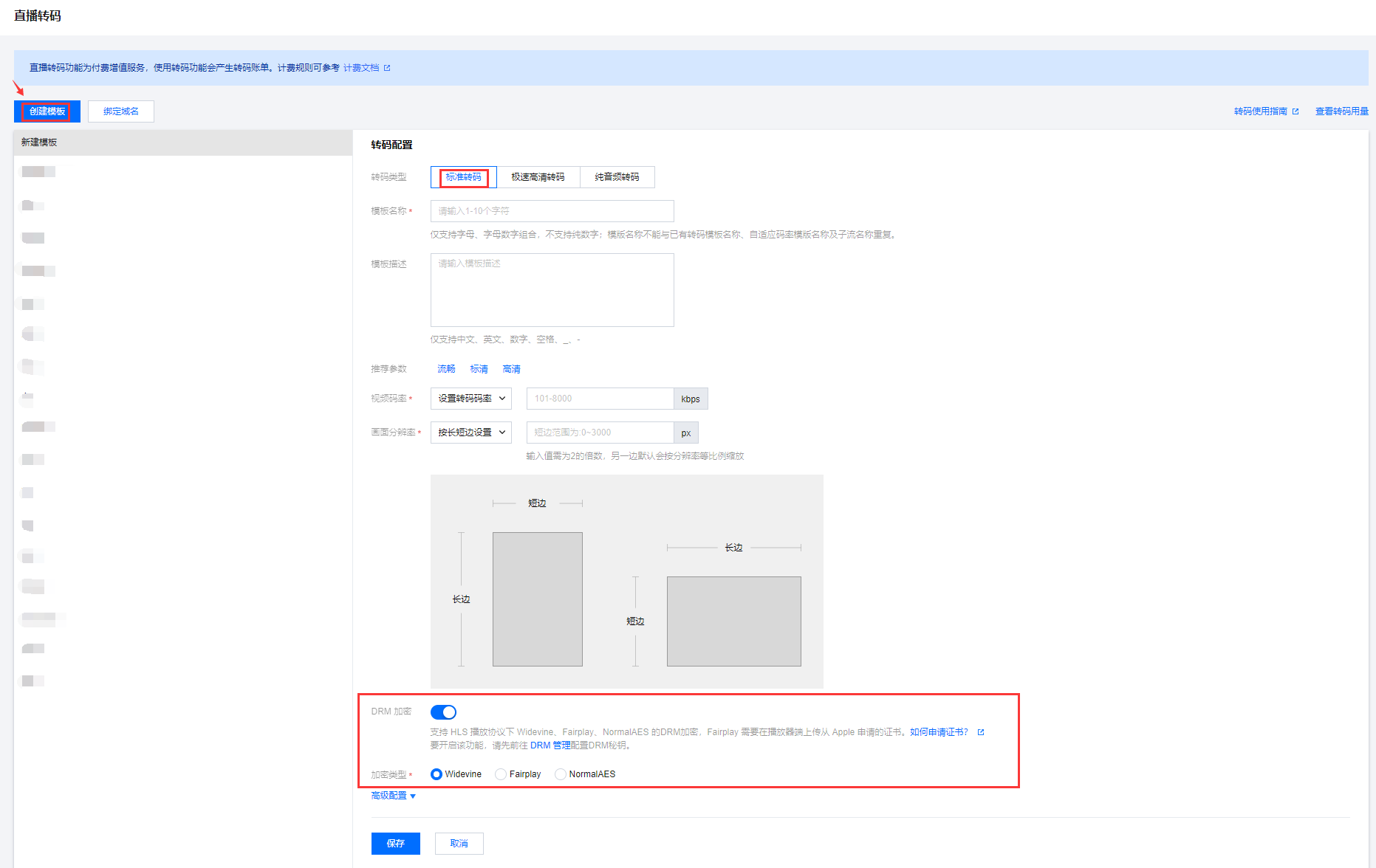 1. 登录云直播控制台,进入 功能配置 > 直播转码。 2. 单击创建模板进入转码配置页面,单击开启 DRM 加密。设置 DRM 加密信息。 |